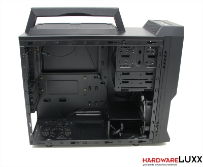 Der Innenraum des Vulcans zeigt sich ganz in Schwarz. Der Mainboardtray bietet eine großflächige Aussparung, durch die man CPU-Kühler mit Backplate montieren kann. Bei unserem Testsystem wäre das allerdings nicht möglich gewesen - die oberen Montagelöcher für den CPU-Kühler befanden sich außerhalb der Aussparung.