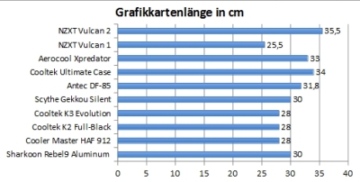 Würde die Grafikkarte auf Höhe der oberen Laufwerkskäfige installiert werden, ist der verfügbare Platz mit rund 25,5 cm knapp bemessen. Durch den Freiraum zwischen den Laufwerkskäfigen können gegebenenfalls auch sehr lange Grafikkarten (bis zu 35,5 cm) verbaut werden.