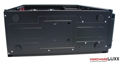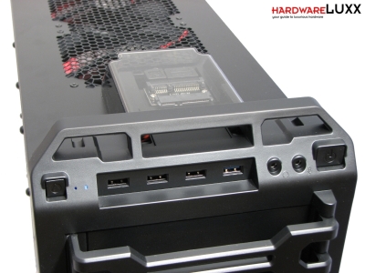 Zur Oberseite des Gehäuses gibt es mehr als zur Unterseite zu sagen. Im hinteren Bereich haben zwei 140-mm-Lüfter Platz gefunden, die im Gegensatz zu den fünf verbauten 120-mm-Modellen nicht beleuchtet werden. Auf Staubfilter hat Antec bei diesen Lüftern verzichtet. Im vorderen Bereich ist die Abdeckung des Hot-Swap-Einschubs für ein 2,5-Zoll-Laufwerk zu sehen, die aus Klarsicht-Kunststoff besteht.