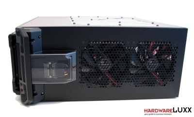 In der oberen rechten Ecke hat auch die Steuerung für die Deckel- und rückseitigen Lüfter Platz gefunden. Anders als bei den Frontlüftern ist diese Steuerung nicht stufenlos, sondern bietet nur zwei Stufen. Für die vier Lüfter kann mit einem Schiebeschalter jeweils einzeln zwischen niedriger und hoher Umdrehungszahl gewählt werden. Da die Lüfter in beiden Modi mit niedrigeren Umdrehungszahlen laufen als die Frontlüfter (1200/800 U/min Deckellüfter, 1500/900 U/min rückseitige Lüfter) bleiben sie auch etwas leiser, sind aber immer noch hörbar.