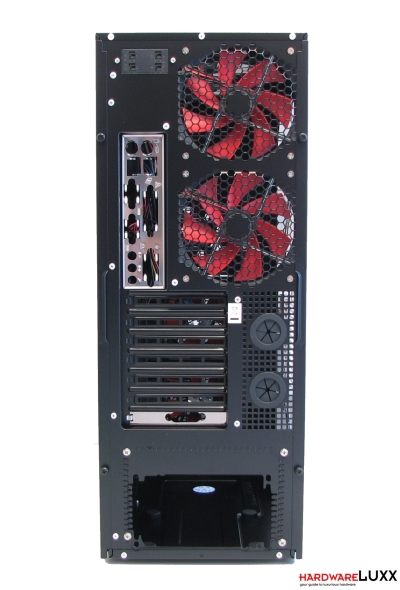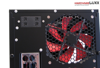 Die Rückseite des Gehäuses beherbergt zwei weitere 120-mm-Lüfter mit roten LEDs. Es gibt zwei Schlauchdurchführungen mit relativ großem Durchmesser und eine spezielle Slotblende, durch die das Anschlusskabel für Front-USB-3.0 geführt werden kann. Noch bieten nur wenige Mainboards Header für USB 3.0, sodass dieses Kabel extern am Mainboard anzuschließen ist.
