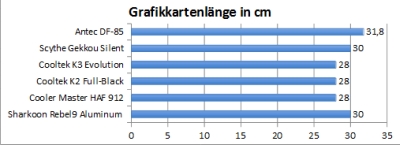 Das Antec DF-85 kann nicht nur eine imposante Lüfterarmada vorweisen, auch die damit erreichten Temperaturwerte sind beeindruckend. Die zum Vergleich herangezogenen Gehäuse spielen zwar in Hinblick auf die Kühlleistung von vornherein in einer anderen Liga - das Dark Fleet-Modell kann die Überlegenheit, die es auf dem Papier besitzt, aber auch in der Praxis voll ausspielen. Durch die Bank werden schon mit minimal möglicher Lüftergeschwindigkeit die niedrigsten Temperaturwerte erreicht. Während die Festplatte nur wenige Grad kühler blieb als in den Vergleichsgehäusen, liegen bei CPU-, GPU- und Mainboardtemperatur Welten zwischen dem Antec-Gehäuse und dem Cooltek K3 Evolution sowie erst recht dem mit Dämmmatten ausgekleideten Scythe Gekkou Silent.