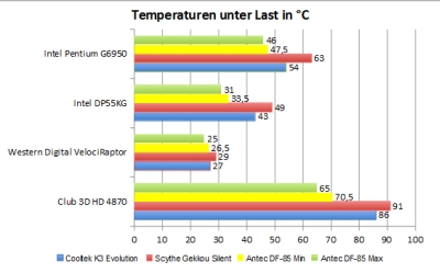 Werden die Lüfter des DF-85 voll aufgedreht, wird der PC zwar richtig laut, die Temperaturen sinken aber nur um wenige Grad. Am deutlichsten wirkt sich das noch bei der Grafikkarte aus, die immerhin 5 Grad kühler bleibt als bei minimaler Lüfterdrehzahl. Zumindest bei unserem Testsystem lohnt es nicht, die Lüfter mit maximaler Geschwindigkeit laufen zu lassen. Umgekehrt wäre es sogar wünschenswert gewesen, wenn Antec einen weiteren Regelbereich der Lüfter nach unten ermöglicht hätte.