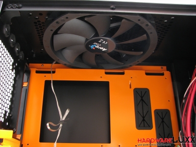 Auch im Deckel hat ein Lüfter mit diesen Ausmaßen Platz gefunden, allerdings in einer Ausführung ohne LEDs. Beide Lüfter haben einen 3-Pin-Anschluss. Sie lassen sich damit entweder an die integrierte Lüftersteuerung oder auch direkt am Mainboard anschließen.