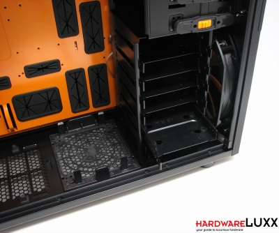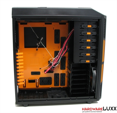 Der Innenraum kann sich mit orangen Elementen optisch deutlich von dem anderer Gehäuse absetzen. Doch auch in Bezug auf Funktionalität muss sich Aerocools Full-Tower nicht verstecken. Der Mainboard-Tray bietet Aussparungen sowohl für die Montage des CPU-Kühlers als auch für Kabelmanagement. Die Kabeldurchführungen sind mit Gummielementen versehen, wie es z.B. auch bei Corsairs Obsidian-Gehäusen der Fall ist. Für die optischen Laufwerke gibt es Schnellverriegelungen.