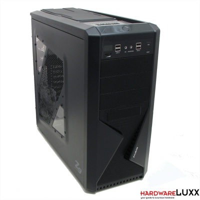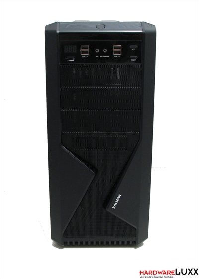 Das Z9 Plus ist ein Stahlgehäuse, dessen Front und Deckel aus Kunststoff bestehen. Zalman macht die eigentlich recht monotone Mesh-Optik mit einem stilisierten "Z" im unteren Bereich interessant. Dieses Initial des Firmennamens hat auch für die Gestaltung des Seitenfensters hergehalten. Optisch auffällig sind daneben Glossy-Elemente beim Übergang zwischen Front und Deckel und das in eine Frontblende integrierte I/O-Panel.