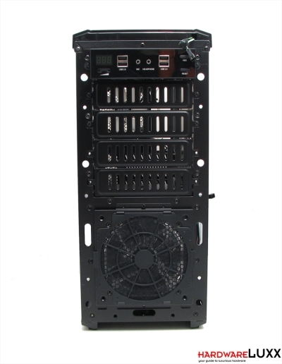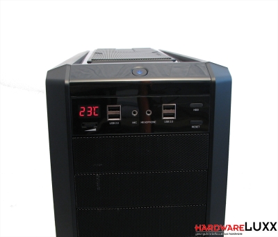 Das I/O-Panel bietet Audio-Anschlüsse und vier USB 2.0-Buchsen. Auch Reset-Schalter und HDD-LED befinden sich auf dieser Blende. Daneben hat Zalman hier aber noch zwei ungewöhnlichere Features untergebracht. Zum einen ist das eine Temperaturanzeige. Der dazugehörige Sensor kann an beliebiger Stelle im Gehäuse angebracht werden, die Anzeige reagiert schnell auf Temperaturänderungen. Zum anderen verbirgt sich hinter dem unscheinbaren Regler unterhalb der Temperaturanzeige eine 2-Kanal-Lüftersteuerung. Zwei der vier Gehäuselüfter lassen sich damit stufenlos innerhalb eines relativ weiten Regelbereichs steuern. Leider ist diese Lösung etwas inkonsequent, kann ohne Adapter doch nur die Hälfte der vier vormontierten Lüfter angeschlossen werden - die anderen beiden bleiben ungeregelt und sind deutlich hörbar. Auch bei den Anschlüssen der Lüfter ist Zalman nicht konsequent - drei Lüfter haben einen 3-Pol-Anschluss, der rückseitige Lüfter wird hingegen per Molex angeschlossen.