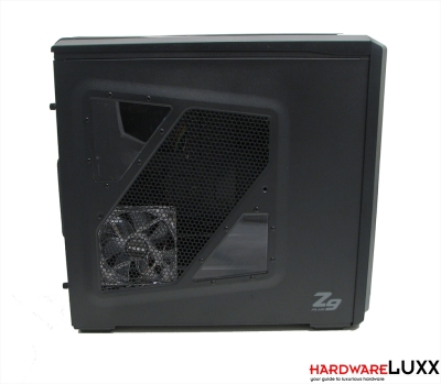 Das Seitenfenster wurde ebenfalls Z-förmig gestaltet. Es setzt sich aus einem grobmaschigem Meshteil (ohne Staubfilter) und zwei kleineren Acrylflächen zusammen. Der montierte 120-mm-Lüfter leuchtet ebenfalls blau. Wird das Seitenteil angebracht bzw. abgenommen, muss auch jedes Mal der Lüfter an- bzw. abgeschlossen werden.