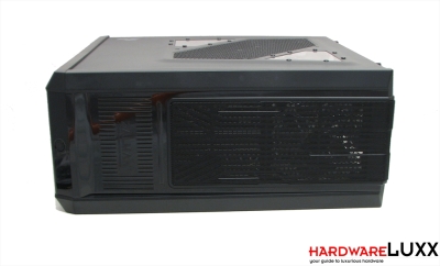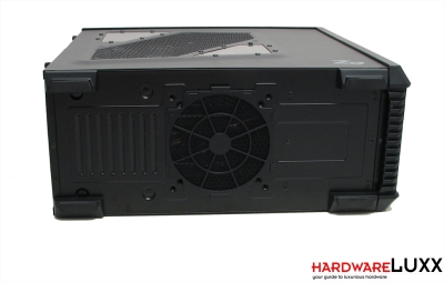 Die Unterseite zeigt eine ungewöhnliche Aufteilung. In der Mitte ist ein Staubfilter zu sehen, hinter dem sich ein optionaler Montageplatz für einen 120- oder 140-mm-Lüfter verbirgt. Für das Netzteil gibt es hingegen nur schmale Belüftungsschlitze. Im Handbuch weist Zalman darauf hin, dass man beim Einsatz des Gehäuses in einer staubigen Umgebung das Netzteil so montieren soll, dass der Lüfter nur Luft aus dem Gehäuseinneren ansaugen kann. Diese Einschränkung hätte leicht vermieden werden können, wenn die Lüftungsöffnungen für das Netzteil so gestaltet worden wären wie die des danebenliegenden optionalen Lüfterplatzes.