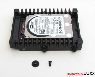 Die Festplatten werden mit einem einfachen, aber praktischen System montiert. Vier Gummipuffer werden mit Schrauben befestigt (von einer wirklich werkzeuglosen Montage kann also keine Rede sein). Der Verbund wird dann einfach in die entsprechenden Führungsschienen des Laufwerkskäfigs geschoben, bis er einrastet. Wenn das Gehäuse mit montierten Festplatten transportiert werden soll, empfiehlt Zalman die Sicherung der Laufwerke mit einer zusätzlichen Schraube.