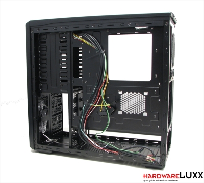 Der Mainboardtray gibt auf den ersten Blick Rätsel auf. Denn neben den Aussparungen für die CPU-Kühlermontage und für das Kabelmanagement gibt es noch eine Zone mit einem Lüftungsgitter. Ein Blick ins Handbuch sorgt für Aufklärung - dieser Platz ist für die Montage einer SSD vorgesehen.