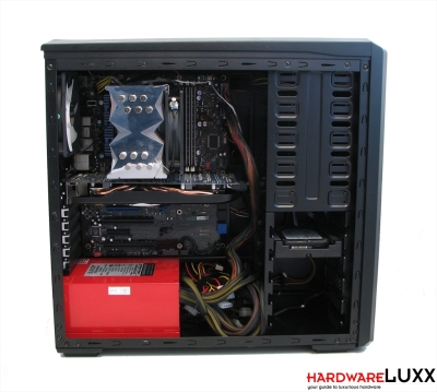 Der Einbau des Testsystems war unproblematisch. Die beiliegende Verlängerung für den 8-Pin-Netzteilstrang erwies sich als praktisch - so kann das entsprechende Kabel problemlos hinter dem Tray verlegt werden. Die Festplattenmontage ging leicht von der Hand. Je nach Vorliebe können die Anschlüsse nach vorn oder hinten herausgeführt werden. Wir entschieden uns für die dezentere Variante, die Kabel rückseitig anzuschließen.