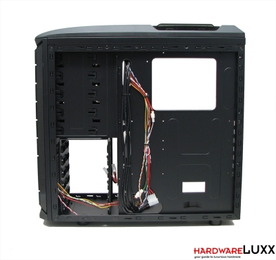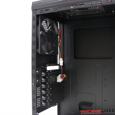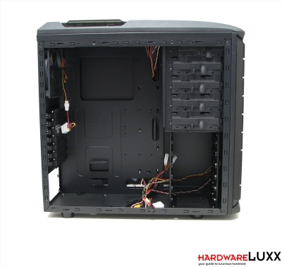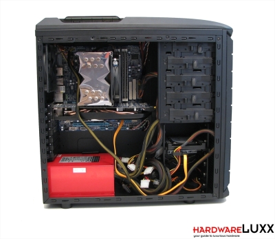 Der Innenraum des Tattoo Pro wurde schwarz lackiert - wie es mittlerweile bei den meisten Gehäusen der Fall ist. Auch die Montage des Netzteils auf dem Gehäuseboden entspricht aktuellen Konventionen. Die zur Entkopplung mitgelieferten Gummipuffer erwiesen sich als wenig hilfreich. Diese müssen aufgeklebt werden, verrutschen aber sehr leicht bei der Installation des Netzteils. Der Laufwerksschacht bietet im oberen Teil eine werkzeuglose Montage für 5,25-Zoll-Laufwerke mittels Kunststoffverriegelung. Auch bei den Festplatten kann man sich den Griff in den Werkzeugkoffer sparen. Diese werden mit Schienen montiert. Kleine Gummiringe sorgen zumindest formal für eine gewisse Entkoppelung.