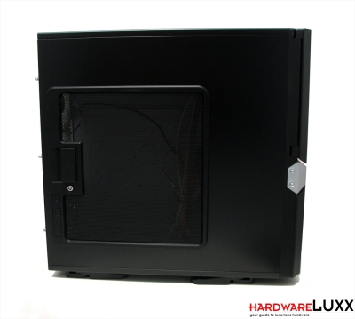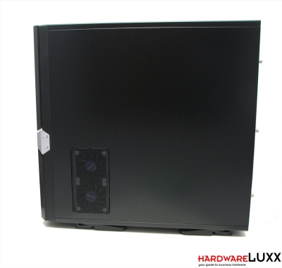 Auch das rechte Seitenteil wird von drei Rändelschrauben fixiert. Ungewöhnlich sind die beiden 80-mm-Lüfter, die Gigabyte zur Kühlung des um 90 Grad gedrehten Laufwerkskäfigs einsetzt. Sie werden von Mesh bedeckt, auf einen richtigen Staubfilter wurde verzichtet. Die Lüfter arbeiten relativ unauffällig.