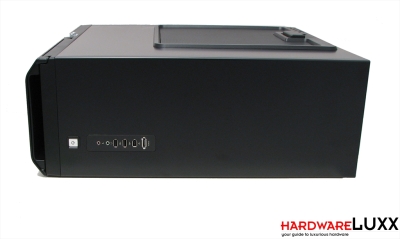 Die Gestaltung des Deckels ist an Schlichtheit kaum zu überbieten. Der An-/Ausschalter leuchtet im Betrieb blau, das I/O-Panel bietet keine Überraschung. Es gibt Audioanschlüsse, zweimal USB 2.0, Firewire und eSATA.