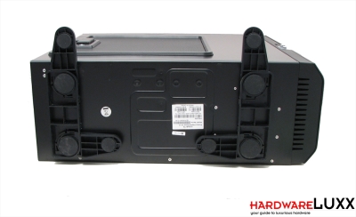 Das Sumo 5112 steht auf Kunststofffüßen mit entkoppelnden Gummielementen. Die Füße können ausgeklappt werden, was für noch mehr Standstabilität sorgt - das hat das solide Gehäuse allerdings nicht wirklich nötig. Im vorderen Bereich sind die Lüftungsöffnungen für den Frontlüfter zu sehen.