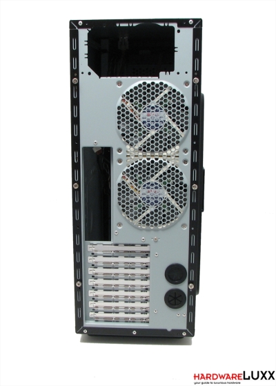Die graue Rückseite beherbergt zwei blau beleuchtete 120-mm-Lüfter. Daneben gibt es zwei Schlauchdurchführungen mit großem Durchmesser. 16-mm-Schlauch passt gut hindurch. Auffällig ist die Montage des Netzteils unter dem Deckel. Bei den meisten neuen Gehäusen wird das Netzteil auf dem Boden untergebracht.