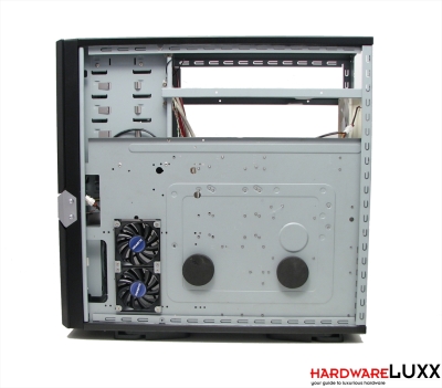 Der Mainboardtray bietet weder Aussparungen für CPU-Kühlermontage noch für Kabelmanagement. Ein unauffälliges Verlegen der diversen Kabel hinter dem Tray ist also nicht möglich.
