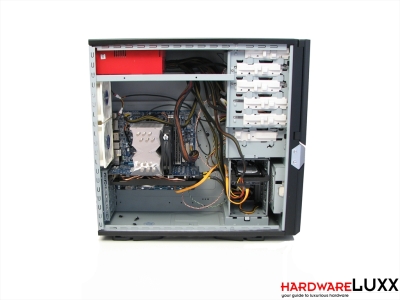 Unser µATX-Mainboard wirkt in dem großen Gehäuse etwas verloren. Der Einbau des Testsystems nahm mehr Zeit als bei den meisten anderen Gehäusen in Anspruch. Problematisch waren die Bohrungen für die Mainboardabstandshalter, die den Einsatz einer Zange erforderten. Auch die Festplattenmontage mit Rändelschrauben und die Montage des Netzteils erwiesen sich als aufwendiger als bei vielen Konkurrenzprodukten.