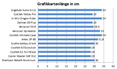 Das Gehäuse kann Grafikkarten mit bis zu etwa 34 cm Länge aufnehmen. In dieser Disziplin liegt es mit einigen anderen Full-Towern an der Spitze.