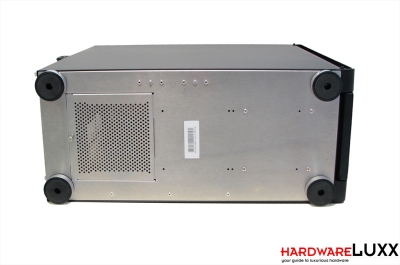 Das XL-Tank steht auf silberfarbenen Füßen, die durch ihre gummierte Unterseite von der Aufstellfläche entkoppelt werden. Das Lochgitter unter dem Netzteil kann nach Lösen einer Rändelschraube abgenommen werden. Dann ist der Staubfilter des Netzteils zur Reinigung erreichbar.
