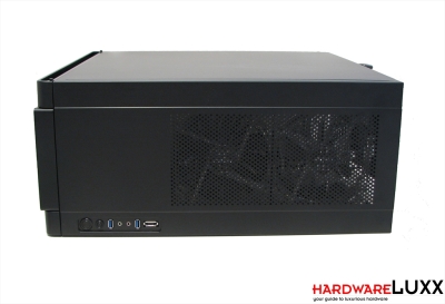 Im hinteren Teil des Deckels haben zwei 140-mm-Lüfter Platz gefunden, die ebenfalls über rote LEDs verfügen. Auch diese Lüfter sollten für ein angenehmes Betriebsgeräusch an einer Lüftersteuerung betrieben werden. Sie werden ebenfalls per 3-Pin-Stecker angeschlossen. Im vorderen Bereich des Deckels hat das gut ausgestattete I/O-Panel seinen Platz gefunden. Es bietet neben Audiobuchsen und eSATA auch zwei schnelle USB-3.0-Anschlüsse. Wer kein USB 3.0-fähiges Mainboard besitzt, kann die USB-Anschlüsse dank des beiliegenden Adapters trotzdem nutzen, indem er sie mit einem internen USB-2.0-Header verbindet. Dann reduziert sich natürlich die Transferrate entsprechend. Die Bedienschalter passen zwar optisch gut - der Reset-Schalter lässt sich aber überraschenderweise etwas hin- und herschieben, er ist also nicht ausreichend fixiert.