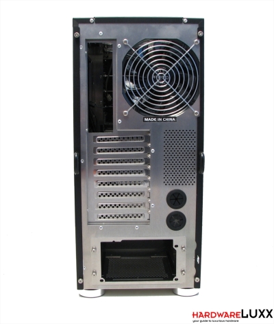 Das Netzteil findet bei Cubiteks Aluminium-Gehäuse auf dem Gehäuseboden Platz. Darüber gibt es zwei Schlauchdurchführungen. Als XL-ATX-Gehäuse kann das XL-Tank ganze acht Erweiterungskartenplätze vorweisen, die von perforierten Slotblenden verdeckt werden. Neben der Aussparung für die I/O-Blende wurde ein dritter 140-mm-Lüfter untergebracht - das einzige unbeleuchtete Modell.