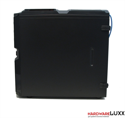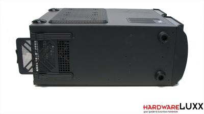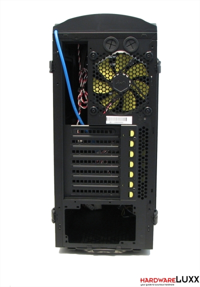 Die Rückseite beherbergt den dritten 120-mm-Lüfter, der vom selben Typ ist wie der Lüfter im Deckel. Auffällig ist das blaue Kabel, das aus dem Kunststoffdeckel herausgeführt wird. Es ermöglicht den Anschluss des USB 3.0-Ports an der Slotblende des Mainboards. Oberhalb des Lüfters gibt es zwei Schlauchdurchführungen für externe Wasserkühlungen. Weniger erfreulich sind die Slotblenden. Bis auf die oberste Blende müssen alle Blenden herausgebrochen werden, sie können danach nicht wiederverwendet werden.