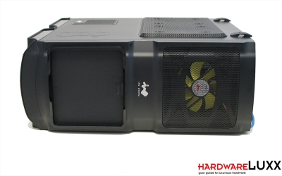 Auch der Deckel wurde mit einem Firmenlogo verziert. Dahinter ist der zweite vormontierte 120-mm-Lüfter zu sehen, der anders als der Frontlüfter nicht von LEDs beleuchtet wird. Im vorderen Bereich gibt es eine Ablagefläche. Hier hat In Win auch den einzelnen USB 3.0-Port verborgen.