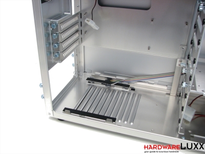 Der Mainboardtray bietet zwar eine großzügige Aussparung im Bereich des CPU-Sockels, aber keine Aussparungen für Kabelmanagement. Auch der Platz zwischen Tray und Seitenteil ist eher knapp.