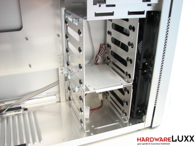 Es gibt zwei Festplattenkäfige, die drei bzw. vier Laufwerke aufnehmen können. Sie können relativ flexibel positioniert werden. Sie lassen sich entnehmen (bei Nutzung langer Erweiterungskarten muss ein Käfig weichen) und um 90 Grad gedreht montieren. Auch für die Montage der Festplatten greift Lian Li auf Rändelschrauben zurück. Durch die Gummidurchführungen werden sie mit den Massenspeichern verschraubt. Sind die Käfige so ausgerichtet montiert wie auf dem Bild, müssen sie zur Festplattenmontage entnommen werden - die hinteren Schraublöcher sind sonst nicht zu erreichen.