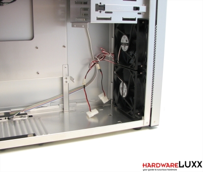 Werden die Laufwerkskäfige entfernt, bietet das Gehäuse gleich einiges mehr an Platz. Alle drei Lüfter werden regulär mit einem 3-Pin-Stecker angeschlossen, sie bieten jedoch auch Adapter auf 4-Pin-Molex.