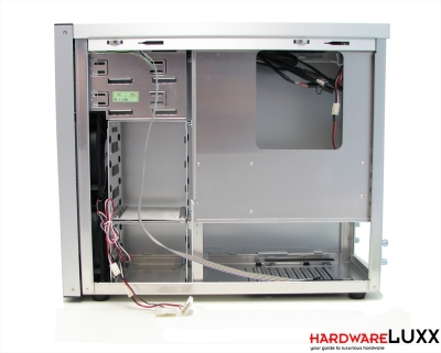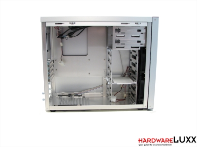 Der Innenraum des Mini-Towers bietet die Optik nackten, glatten Aluminiums. Mit den auf der rechten Seite säuberlich übereinandergestapelten drei Laufwerkskäfigen wirkt er aufgeräumt. Etwas irritierend ist die Länge der internen Anschlusskabel, diese hätten durchaus deutlich kürzer ausfallen können.