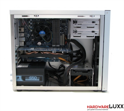 Generell geht es in diesem Gehäuse recht eng zu, Mainboard und Netzteil berühren sich z.B. fast. Das ist jedoch den kompakten Außenmaßen geschuldet und belegt, dass der vorhandene Raum effektiv ausgenutzt wird.