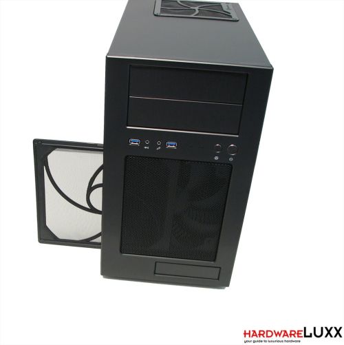 Eine deutliche Verbesserung gegen dem TJ08 stellen die neuen Staubfilter dar. SilverStone hat hier ganze Arbeit geleistet, so leicht wie beim TJ08-E fällt die Entnahme wohl momentan bei keinem anderen Gehäuse. Der Filter des Frontlüfters kann einfach seitlich herausgezogen werden. Der Netzteilfilter oben auf dem Deckel wird hingegen nur von Magneten an seiner Position gehalten und ist damit noch schneller entfernbar.