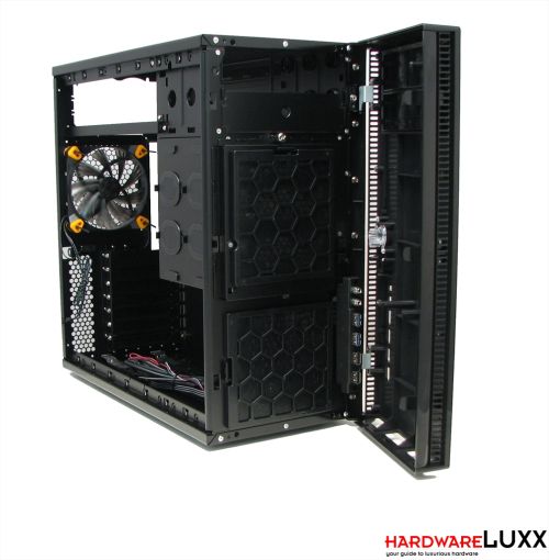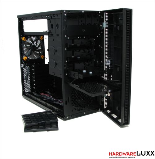 Um eine der größte Besonderheit des SOLO II, den HDD-Käfig, in Augenschein nehmen zu können, ist die Front zu öffnen. Nachdem drei Kunststoffnasen im Gehäuseinneren gelöst wurden, kann die Front einfach wie eine Tür geöffnet werden. Hinter der Tür zeigen sich die beiden optionalen 120-mm-Lüfterplätze, die jeweils mit einem entfernbaren Staubfilter ausgestattet wurden.