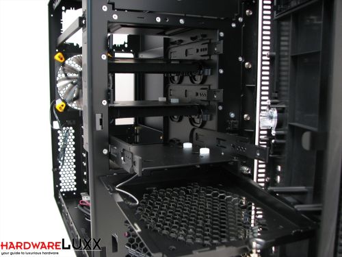 Hinter dem Käfig für den oberen Frontlüfter kommen die Festplatteneinschübe zum Vorschein.
