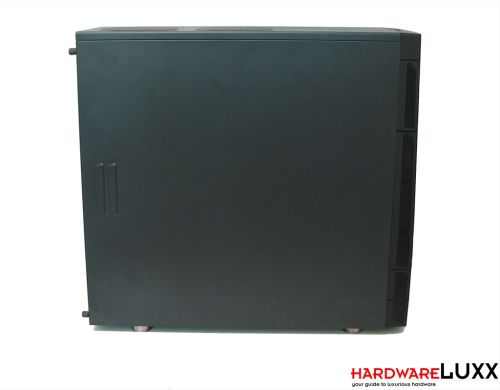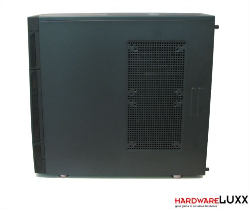 Das linke Seitenteil bietet hingegen keinen Lüfterplatz, sondern ist geschlossen. Beide Seitenteile weisen zwei Auswölbungen auf, die das Abnehmen erleichtern sollen. Sie werden mit jeweils zwei Rändelschrauben fixiert.