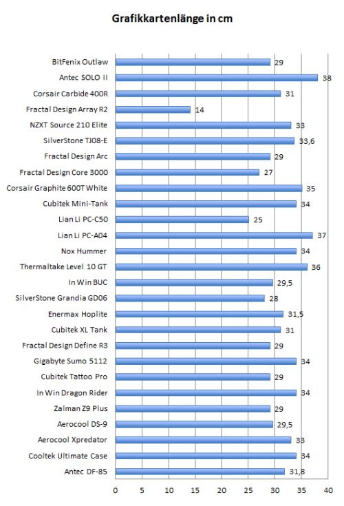 Grafikkarten können bis zu 29 cm lang sein, ohne in die 5,25-Zoll-Einschübe des Outlaws hineinzuragen. Das Gehäuse kann allerdings auch deutlich längere Grafikkarten aufnehmen - diese blockieren dann jedoch die 5,25-Zoll-Laufwerksplätze.