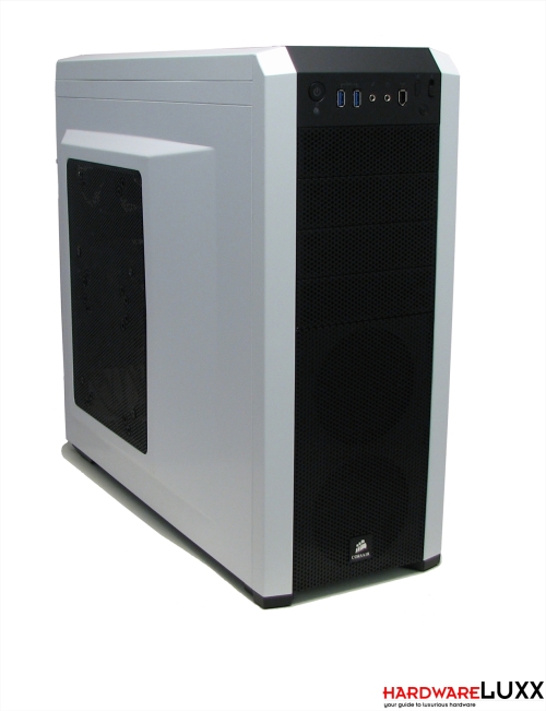 Die Optik des Carbide Series 500R wird in der vorliegenden Variante vor allem von der ungewöhnlichen Farbgestaltung bestimmt. Schwarz und Weiß wechseln sich ab, das Gehäuse wirkt wie gestreift. Der recht groß geratene Midi-Tower 205 (B) x 502 (H) x 520 mm (T) besteht aus einem Stahlgerüst, Front und Deckel weisen Kunststoffverkleidungen und großflächige Mesh-Elemente auf.