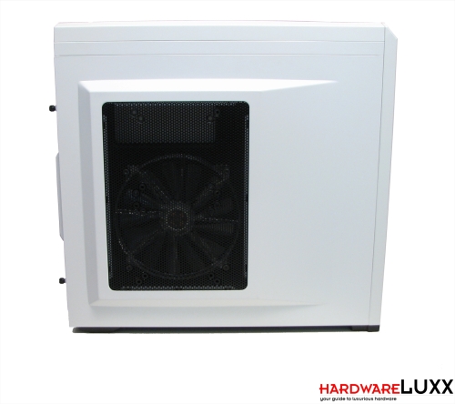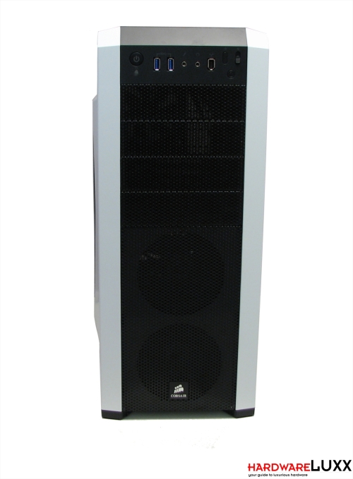 Zwischen den seitlichen weißen Streifen haben zwei 120-mm-Lüfter Platz gefunden, die passenderweise über weiße LEDs verfügen. Vor den Lüftern übernimmt ein engmaschiges Drahtgitter die Funktion eines Staubfilters. Mit Staubilftern wurden auch die Slotblenden der vier 5,25-Zoll-Laufwerkseinschübe ausgestattet. Im oberen Bereich der Front haben gut erreichbar Bedienelemente und I/O-Panel ihren Platz eingenommen. Das I/O-Panel ist mit zwei USB 3.0-Ports, Audiobuchsen und Firewire gut ausgestattet.
