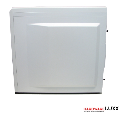 Auch das rechte Seitenteil hat einen gewölbten Mittelteil. Hier dient er dem Zweck, mehr Platz für das Verlegen von Kabeln zwischen Mainboard-Tray und Seitenteil zu schaffen. Beide Seitenteile können dank rückseitiger Griffmulde leicht abgenommen werden. Zur Sicherung dienen fixierte Rändelschrauben, die auch nach dem Lösen am Seitenteil verbleiben.