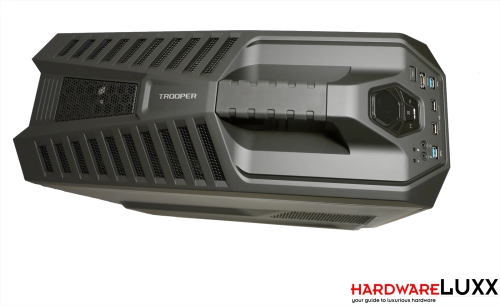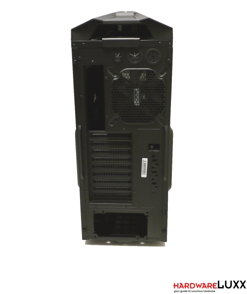 Die Rückansicht verdeutlicht, dass sich im Trooper auch Mainboards unterbringen lassen, die das ATX-Format sprengen. Ganze neun Slotblenden sorgen dafür, dass auch XL-ATX-Mainboards verbaut werden können. Die Rückseite bietet daneben noch einem 140-mm-Lüfter und drei Schlauchdurchführungen Platz.