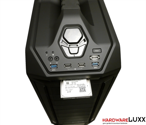 Das I/O-Panel ist mit je zwei USB 3.0- und USB 2.0-Ports, eSATA und Audiobuchsen gut ausgestattet. Oberhalb der Anschlüsse hat die Lüftersteuerung ihren Platz gefunden, auf die wir an späterer Stelle noch genauer eingehen werden.