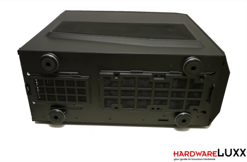 Dank ihrer gummierten Unterseite werden die vier Standfüße vom Boden entkoppelt. Auffällig sind die beiden Staubfilter, die sich zur Reinigung nach vorne bzw. hinten herausziehen lassen. Während der hintere Filter das Netzteil vor Staubeintritt schützt, deckt der vordere Filter zwei optionale 120-mm-Lüfterplätze im Boden ab.