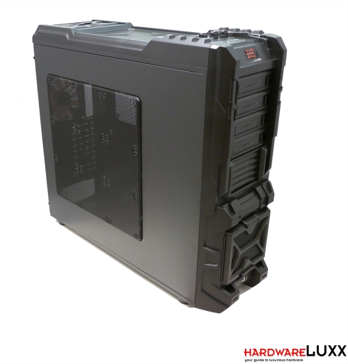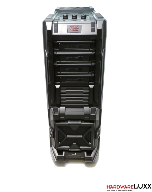 Im oberen Bereich können vier 5,25-Zoll-Laufwerke montiert werden. Die Laufwerksblenden lassen sich leicht abnehmen, nachdem die seitlichen Arretierungen durch Drücken gelöst wurden. Auf der rechten Seite der Laufwerkseinschübe wurden die unauffälligen Power- und Resettaster platziert.