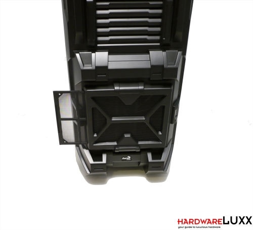 Das linke Seitenteil wird von einer großen Mesh-Fläche dominiert, die vielfältige Möglichkeiten zur Montage von optionalen Lüftern bietet. Ganze neun 120-mm-Lüfter lassen sich anbringen, um gezielt Frischluft dorthin zu befördern, wo sie am meisten gebraucht wird. Auf einen zusätzlichen Staubfilter hinter dem Mesh hat Aerocool verzichtet.