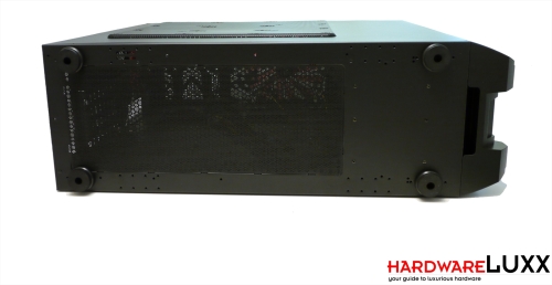 Auch der Boden des Strike-X ST ist auf Kühlleistung ausgelegt. Wie im Deckel lassen sich hier zwei 200-mm- oder drei 120- bzw. 140-mm-Lüfter montieren - zumindest dann, wenn der Netzteilplatz im Boden frei bleibt. Ein Filter soll verhindern, dass Staub ins Gehäuse gelangt. Er kann allerdings zur Reinigung nicht so leicht entfernt werden wie der Staubfilter in der Front. Im Auslieferungszustand steht das Gehäuse auf vier entkoppelnden Standfüßen, die aber gegen die beiliegenden Rollen getauscht werden können. Dann ist das Gehäuse leichter zu bewegen, wird aber auch nicht mehr vom Boden entkoppelt.