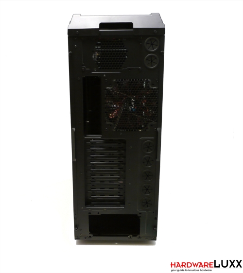 Die Gestaltung der Rückseite veranschaulicht gut die Gehäusehöhe. Schließlich passen zwei Netzteile und ein Mainboard mit bis zu zehn Erweiterungskartenslots übereinander. Beachtlich ist auch die Anzahl an Schlauchdurchführungen - es sind insgesamt sieben Stück vorhanden, allesamt mit beachtlichem Durchmesser. Teil der Luftkühlung ist der verbaute rückseitige 140-mm-Lüfter, der ebenfalls über rote LEDs verfügt.