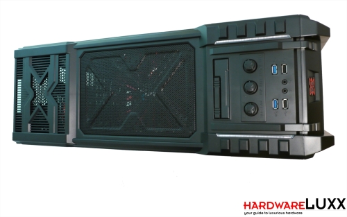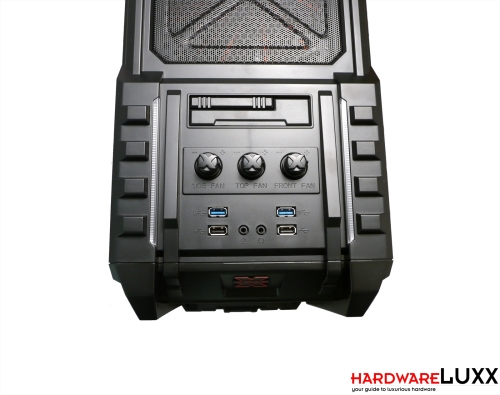 Das I/O-Panel ist gut erreichbar im vorderen Bereich des Deckels zu finden. Die Anschlussausstattung ist mit je zwei USB 3.0- und USB 2.0-Ports sowie Audiobuchsen angemessen. Mehr als angemessen ist die verbaute Lüftersteuerung. Über drei Regler können jeweils sechs Lüfter gesteuert werden. Insgesamt lassen sich also bis zu achtzehn Lüfter stufenlos steuern. Der Regelbereich könnte allerdings noch etwas weiter nach unten reichen, denn die drei verbauten Lüfter sind auch auf der minimalen Stufe noch hörbar. Positiv fällt auch der SATA-Hot-Swap-Einschub hinter den Reglern auf. Ein 2,5- oder 3,5-Zoll-Laufwerk kann hier blitzschnell angebunden werden.